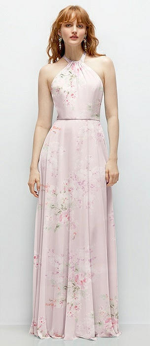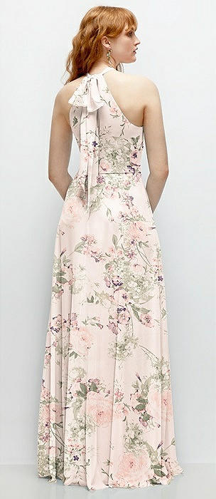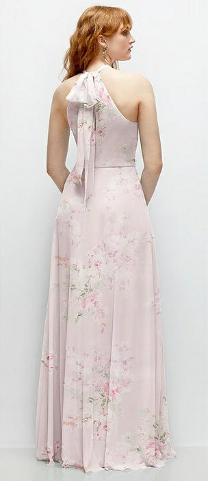Shirred Halter Chiffon Maxi Dress with Back Sash-Tie Closure in blush garden