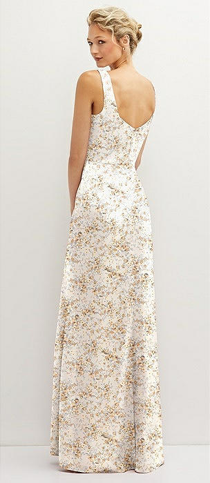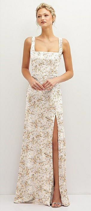 Floral Square-Neck Satin A-line Maxi Dress with Front Slit in golden hour
