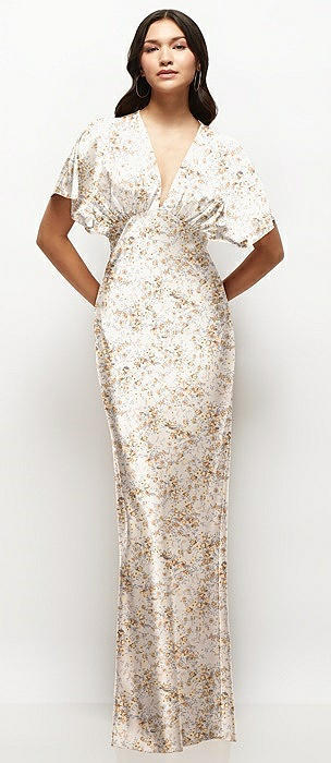 Plunge Neck Kimono Sleeve Floral Satin Bias Maxi Dress in golden hour