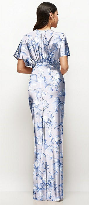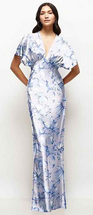 Plunge Neck Kimono Sleeve Floral Satin Bias Maxi Dress in magnolia sky