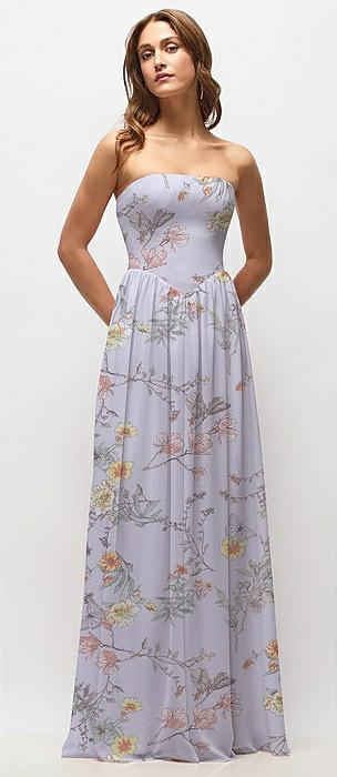 Strapless Basque Drop Waist Floral Chiffon Maxi Dress with Shirred Skirt in butterfly botanica silver dove