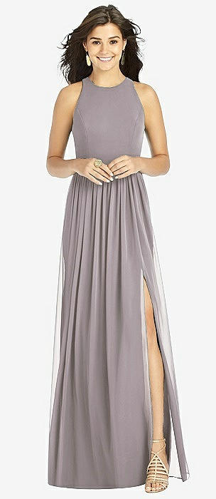 Shirred Skirt Jewel Neck Halter Dress with Front Slit