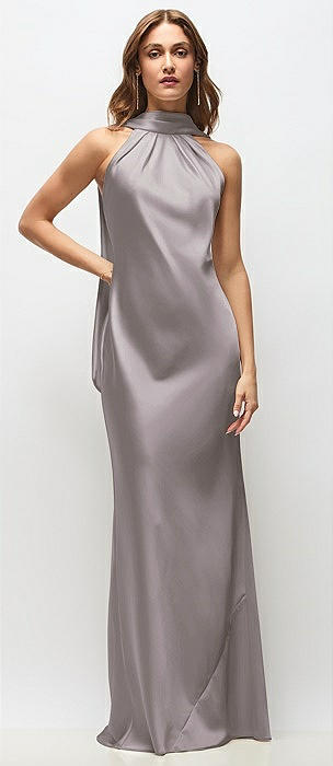 Draped Scarf Halter Open-Back Stretch Satin Bias Maxi Dress with Adjustable Straps in cashmere gray