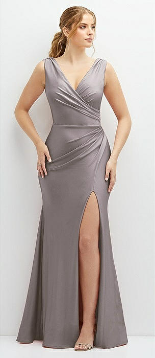 Shirred Shoulder Stretch Satin Mermaid Dress with Slight Train in cashmere gray