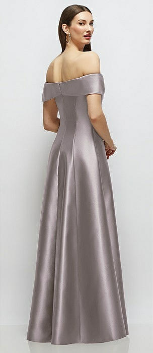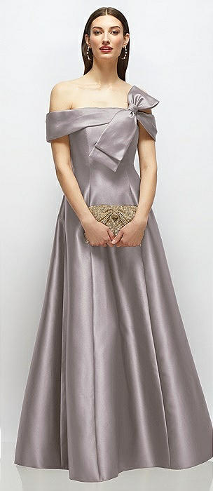 Asymmetrical Bow Off-Shoulder Satin Gown with Ballroom Skirt in cashmere gray