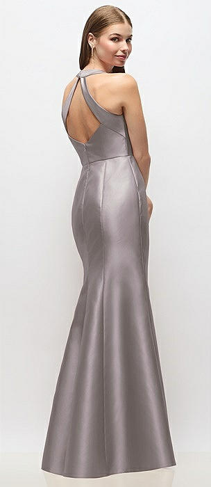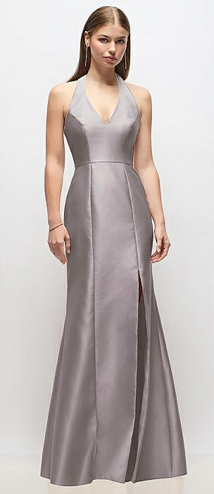 V-Neck Halter Satin Trumpet Gown in cashmere gray