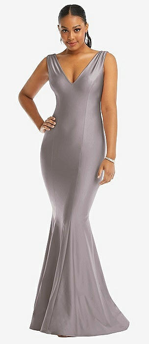 Shirred Shoulder Stretch Satin Mermaid Dress with Slight Train in cashmere gray