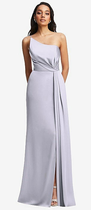 One-Shoulder Draped Skirt Satin Trumpet Gown in silver dove