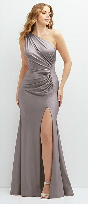 One-Shoulder Bias-Cuff Stretch Satin Mermaid Dress with Slight Train in silver dove