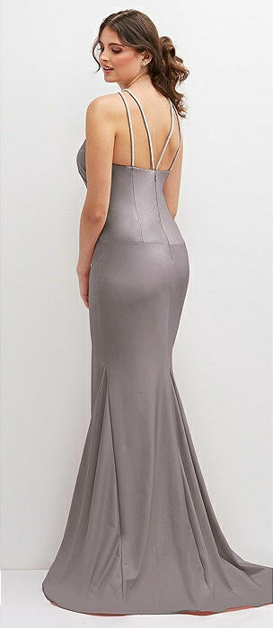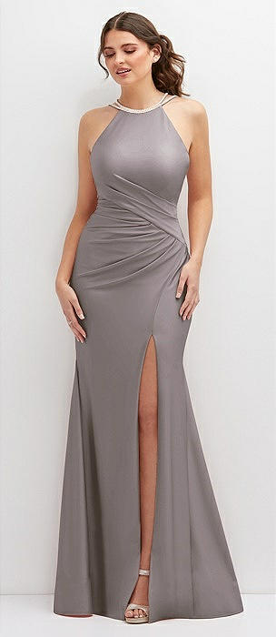 Halter Asymmetrical Draped Stretch Satin Mermaid Dress with Rhinestone Straps in cashmere gray