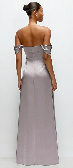 Basque-Neck A-Line Stretch Satin Maxi Dress with Off-the-Shoulder Drape in cashmere gray