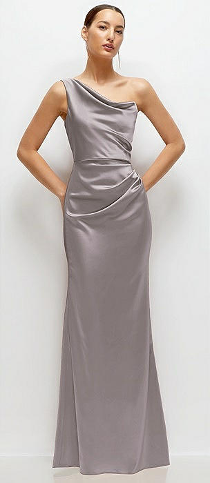 One-Shoulder Draped Cowl A-Line Satin Maxi Dress in cashmere gray