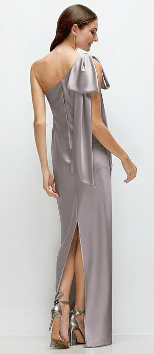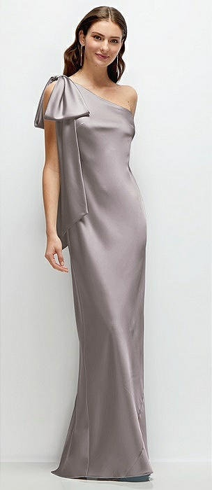 One-Shoulder Bias-Cut Satin Maxi Dress with Cascading Shoulder Bow in cashmere gray