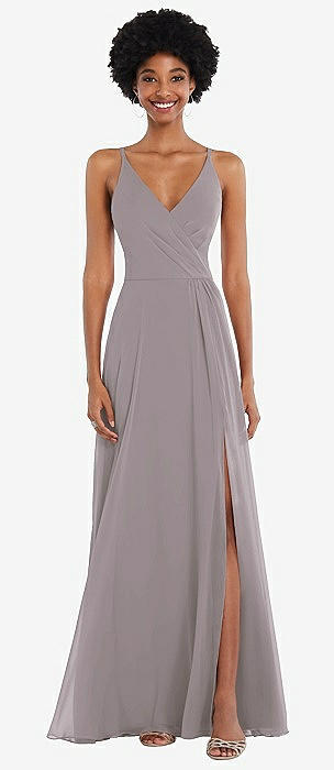 Spaghetti Strap Draped Skirt Gown with Front Slit in cashmere gray