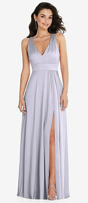 Shirred Shoulder Criss Cross Back Maxi Dress with Front Slit in silver dove