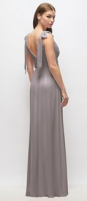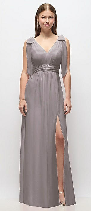 Plunge Neckline Bow Shoulder Empire Waist Chiffon Maxi Dress in cashmere gray