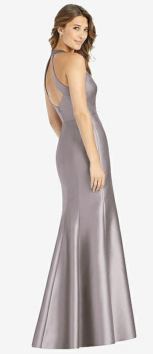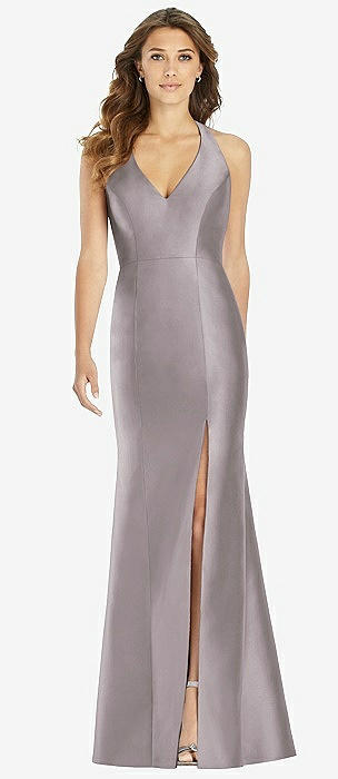 V-Neck Halter Satin Trumpet Gown in cashmere gray
