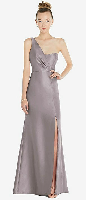 Draped One-Shoulder Satin Trumpet Gown with Front Slit in cashmere gray