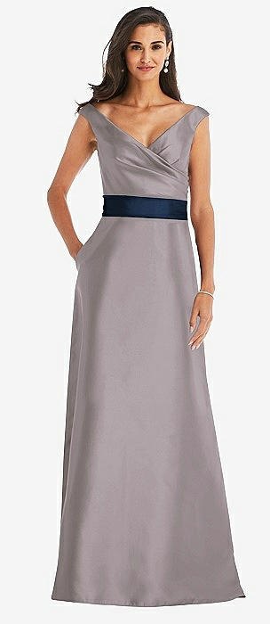 Off-the-Shoulder Draped Wrap Satin Maxi Dress in cashmere gray