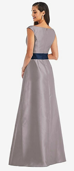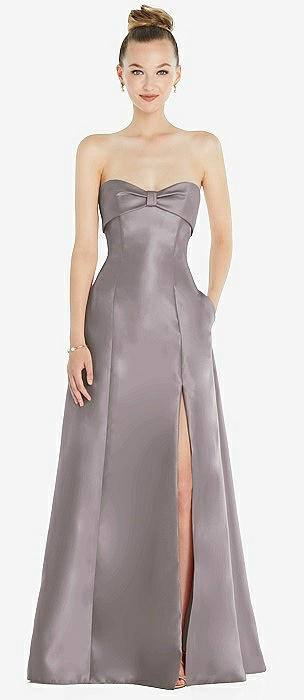 Bow Cuff Strapless Satin Ball Gown with Pockets in cashmere gray