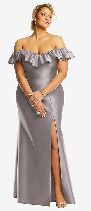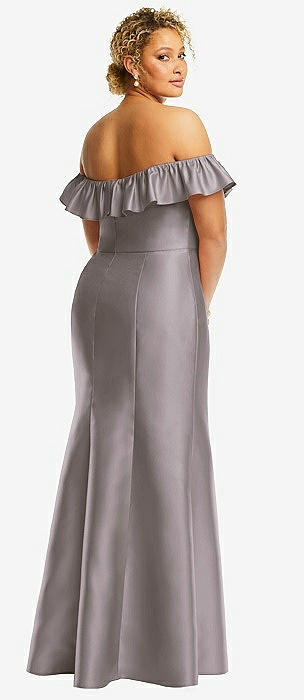 Off-the-Shoulder Ruffle Neck Satin Trumpet Gown in cashmere gray