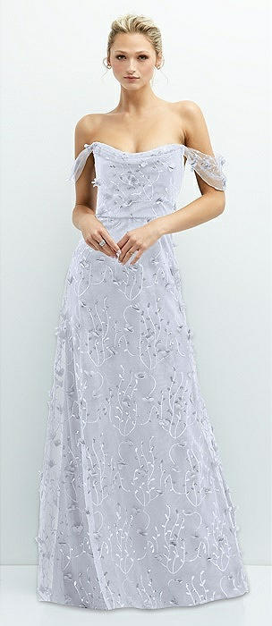 Off-the-Shoulder A-line 3D Floral Embroidered Dress in silver dove