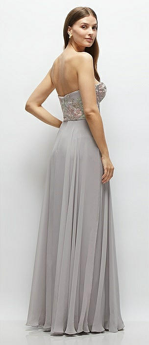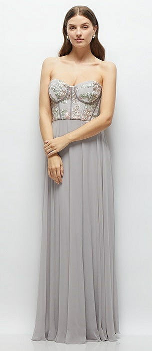 Strapless Floral Embroidered Corset Maxi Dress with Chiffon Skirt in cashmere gray