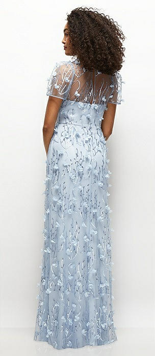 3D Floral Embroidered Puff Sleeve A-line Maxi Dress with Petal-Adorned Illusion Neckline in silver dove