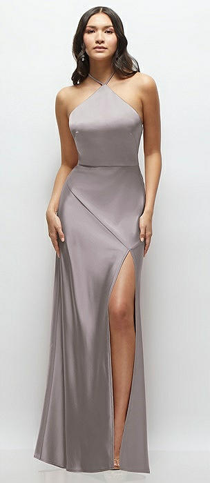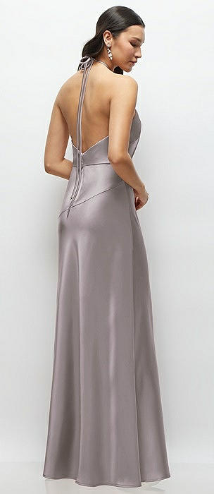 High Halter Tie-Strap Open-Back Satin Maxi Dress in cashmere gray