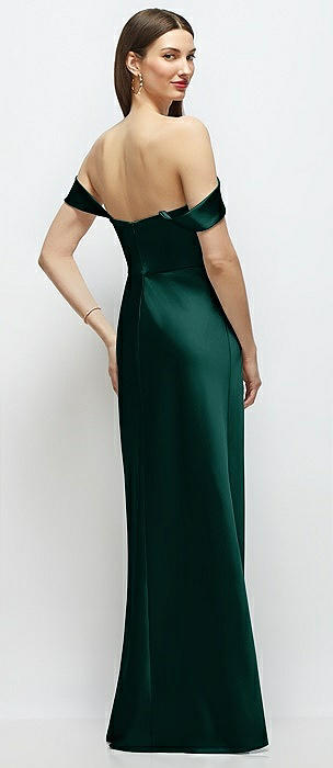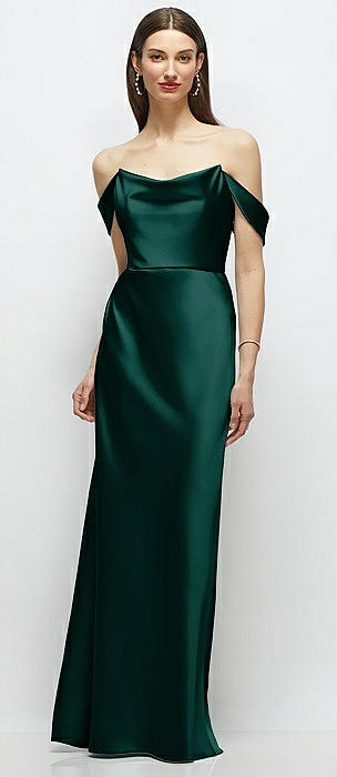 Basque-Neck A-Line Stretch Satin Maxi Dress with Off-the-Shoulder Drape in evergreen