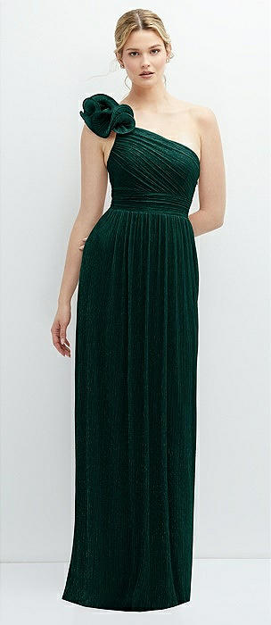 Dramatic Ruffle Edge One-Shoulder Metallic Pleated Maxi Dress in metallic evergreen