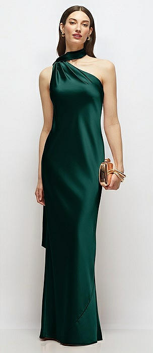 Draped Scarf One-Shoulder Bias Stretch Satin Maxi Dress in evergreen