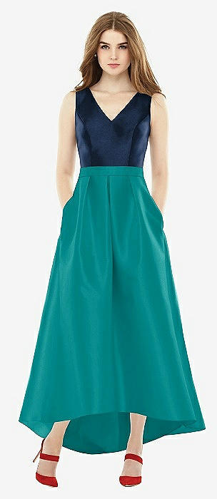 Strapless Satin High Low Dress with Pockets in evergreen