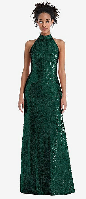 Stand Collar Halter Sequin Trumpet Gown in hunter green