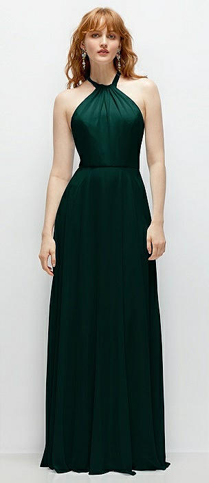 High-Neck Halter Chiffon Maxi Dress with Adjustable Spaghetti Straps in evergreen