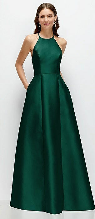 High-Neck Halter Open-Back Satin Trumpet Dress in evergreen