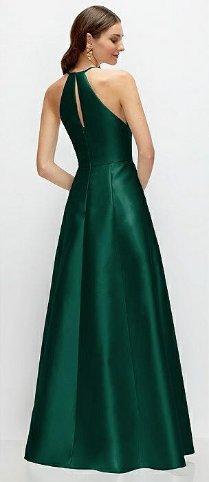 Jewel Neck Halter Full A-Line Satin Maxi Dress in hunter green