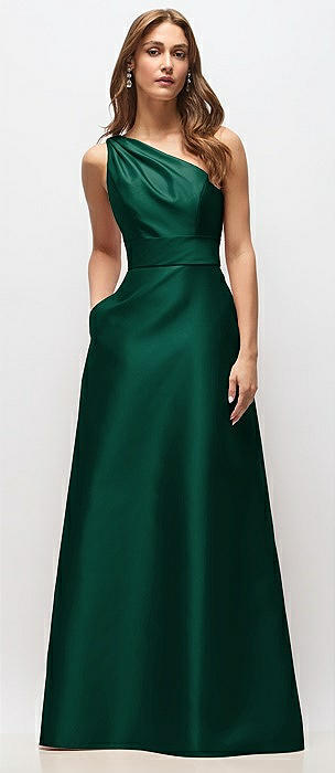 Draped One-Shoulder Satin Maxi Dress with Pockets in hunter green