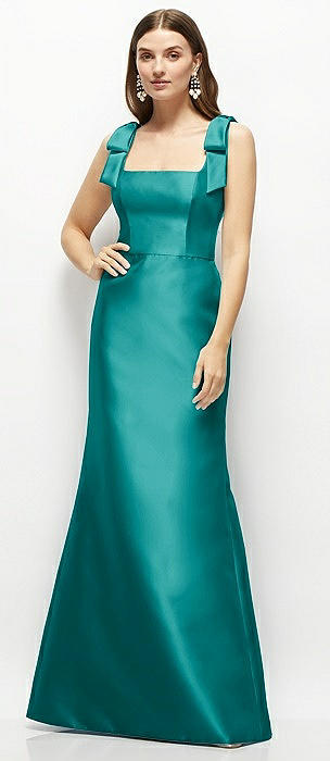 Satin Fit and Flare Maxi Dress with Shoulder Bows in jade