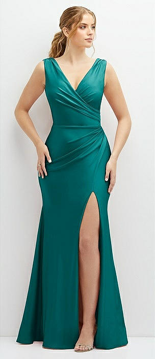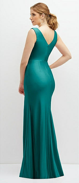 Deep V-Neck Stretch Satin Mermaid Dress with Slight Train in peacock teal