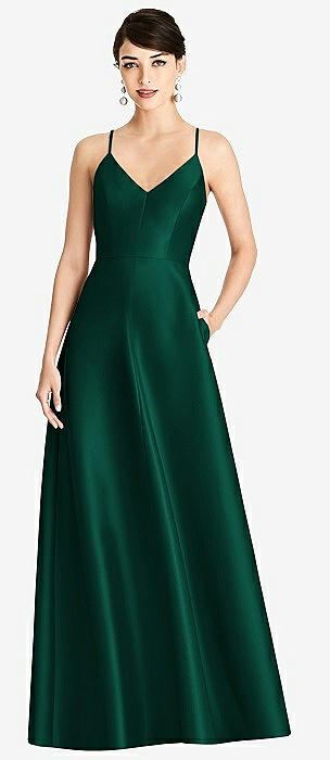 V-Neck Full Skirt Satin Maxi Dress in hunter green