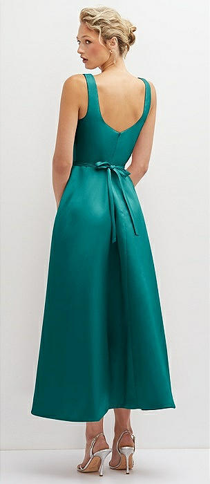 Square Neck Satin Midi Dress with Full Skirt & Pockets in jade