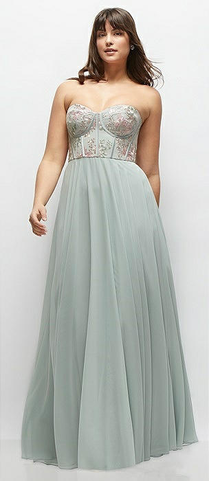 Strapless Floral Embroidered Corset Maxi Dress with Chiffon Skirt in willow green