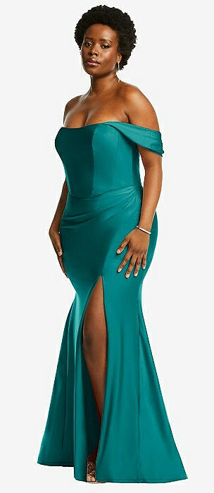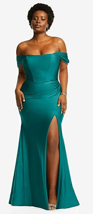 Off-the-Shoulder Corset Stretch Satin Mermaid Dress with Slight Train in peacock teal