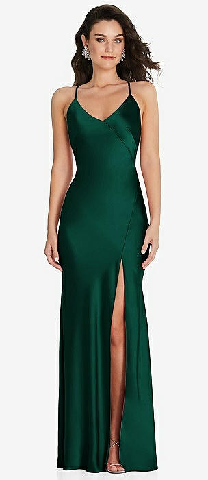 V-Neck Convertible Strap Bias Slip Dress with Front Slit in hunter green