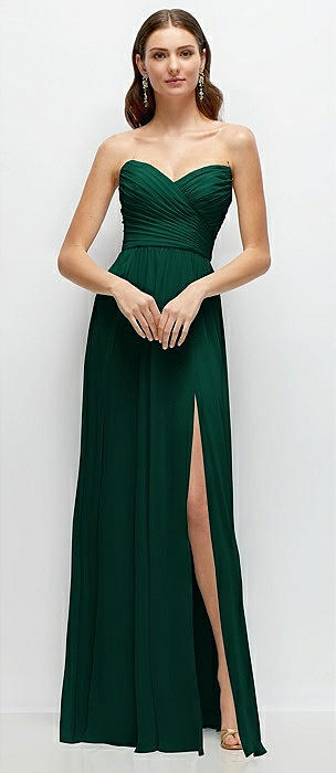 Strapless Pleated Surplice Chiffon Maxi Dress with A-Line Skirt in hunter green