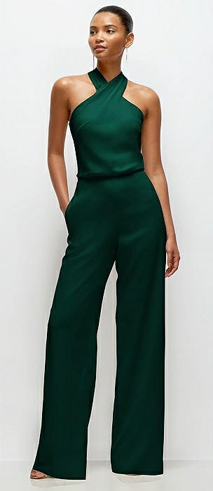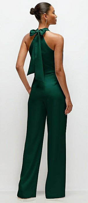 Pleated Halter Blouson Crepe Wedding Jumpsuit with Self-Tie Bow Back in hunter green