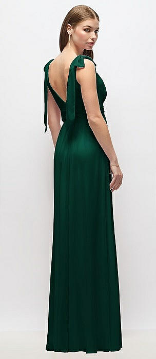 Plunge Neckline Bow Shoulder Empire Waist Chiffon Maxi Dress in hunter green