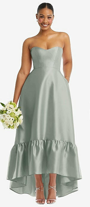 Strapless Deep Ruffle Hem Satin High Low Dress with Pockets in willow green