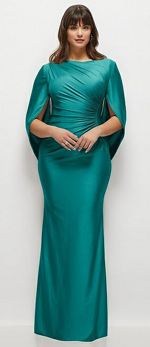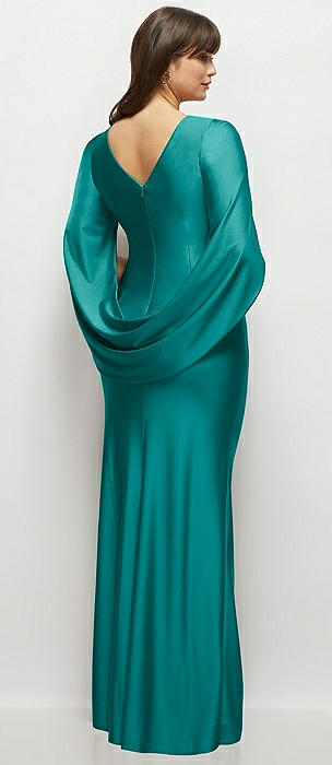 Draped Stretch Satin Maxi Dress with Built-in Capelet in peacock teal